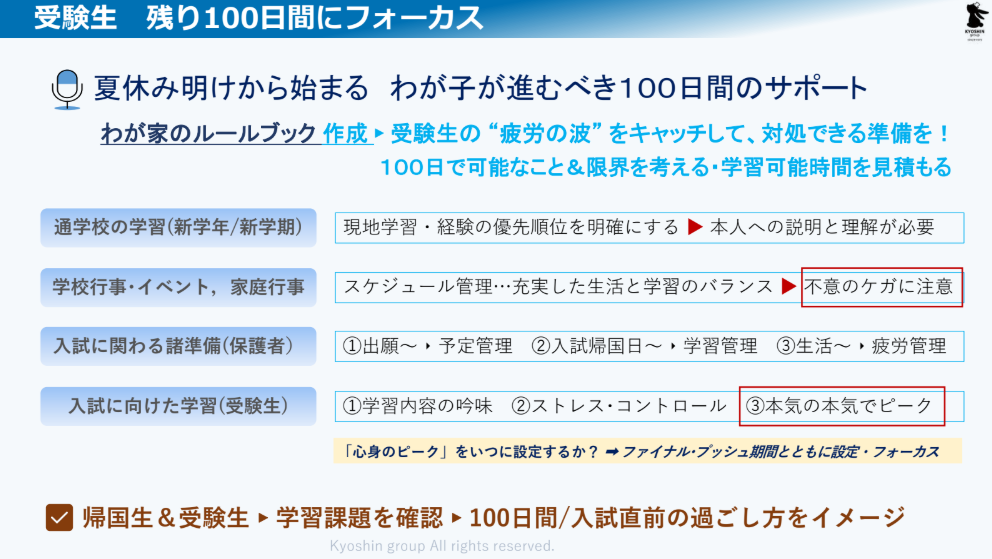 加えて、子どもの性格や心の様子から怪我や病気に注意しておきましょう。日本で電車に乗って塾に通うなど、大人にとっては些細なことでも子どもにとっては疲れや精神的な不安定が重なり、怪我と病気に繋がります。肩こりや頭痛、眠れないなど子どもの弱い部分に症状が現れます。100日間のサポートをしっかりと考えておきましょう。