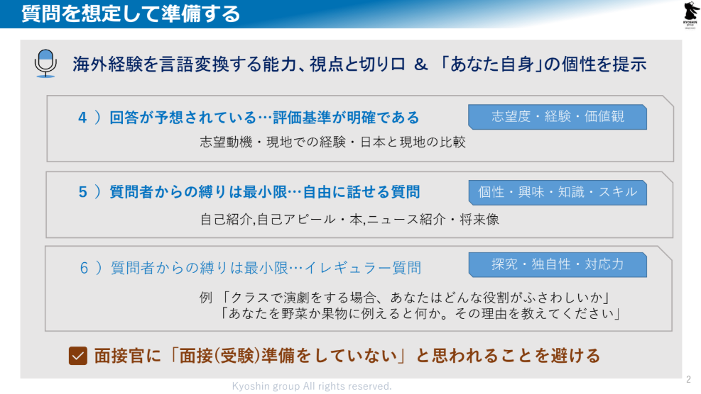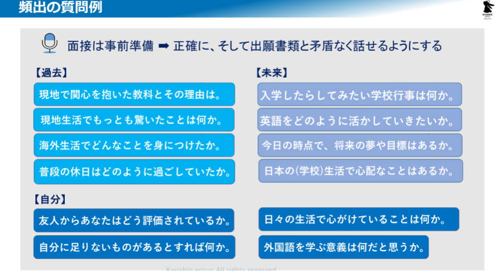 また、海外経験・海外生活から未来の学校生活へ接続、過去から未来へのストーリー設計はしっかりと準備しておきます。「今までこのようなことに取り組んできました。そして志望校では、今後はこのようなことをしたいです。」というストーリーを話せるように。