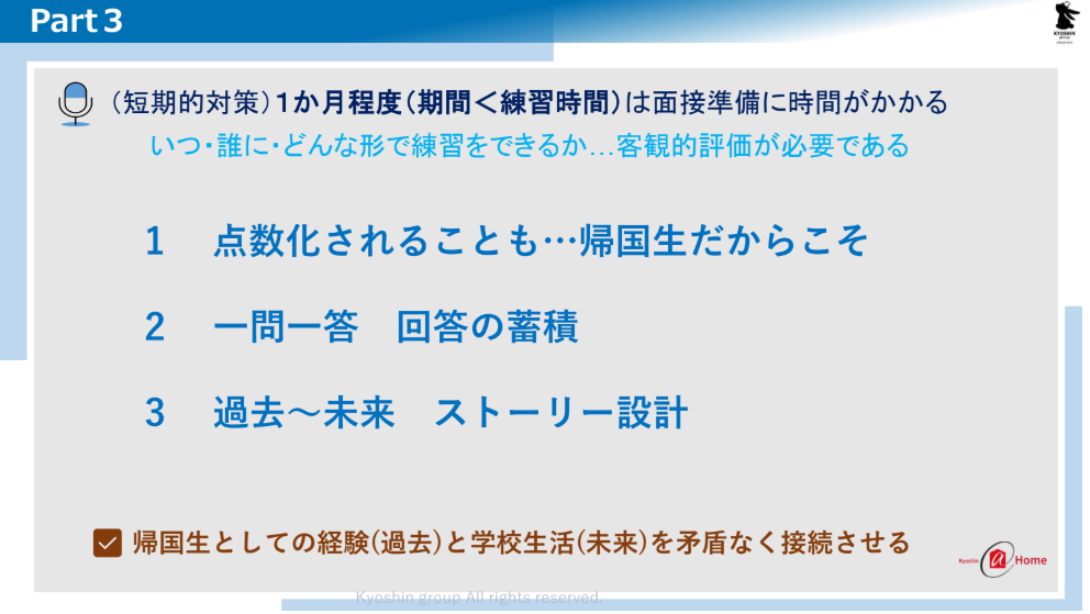 面接対策には、1~3か月は確保してほしい。ただし、期間より練習時間と準備時間が重要です。入試帰国後も含めて、いつ・誰に・どのような形式で練習するかを明確にしましょう。客観的な評価も必要です。一問一答形式であれば、親子でも取り組むことができます。
