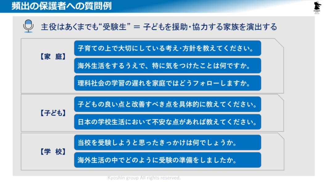 この質問では、「我が家らしさ」が感じられ、子どもへの接し方やこれまでどのように育ててきたかが伝わることが重要です。特別なことである必要はありませんが、「我が家らしさ」や「家族らしさ」を意識して答えましょう。また、これまで親がどんな選択をしてきたのかに加え、海外生活で得た視点が含まれていると、より良い印象を与えられます。