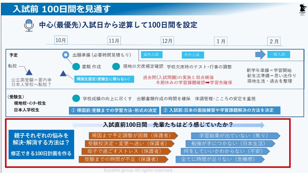 | <親の悩み> ①帰国までの予定調整が困難 ②受験校決定・変更への迷い ③親子で過ごすストレス ④受験までの時間が不足 |