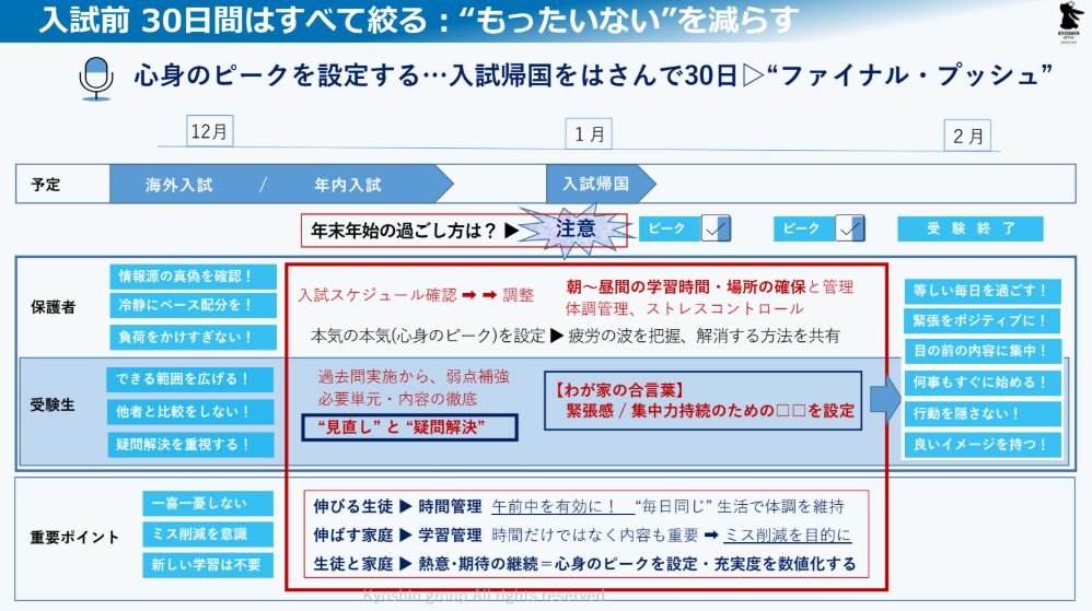 年末年始の過ごし方は非常に重要です。受験に向けてピークを作っていく中で、勉強のリズムが乱れやすいこの時期には特に注意が必要です。一度リズムが崩れると、元に戻すのに1週間ほどかかります。特に年明けは、入試結果に直結する大切な時期です。模試を受けなくなって(最後の模試が終わって)から、努力次第で結果が大きく変わるとも言われています。