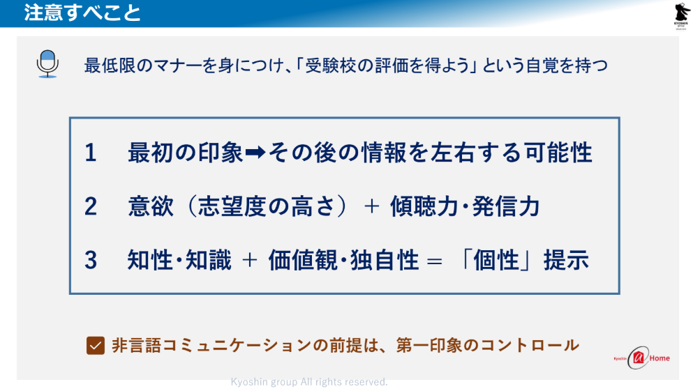 面接では、意欲や志望度の高さも重要な評価ポイントです。「この学校に通いたい」「ここで学びたい」という関心や意欲がしっかり伝わるかどうかが見られています。そのためには、受け取る(傾聴力)・伝える(発信)という双方のコミュニケーション姿勢が大切です。特に、話を「伝わるように話す力」は、練習によって身につきます。子どもは自分では分かっているつもりでも、初対面の大人にはうまく伝わらないことがあるということを理解させておくことが必要です。