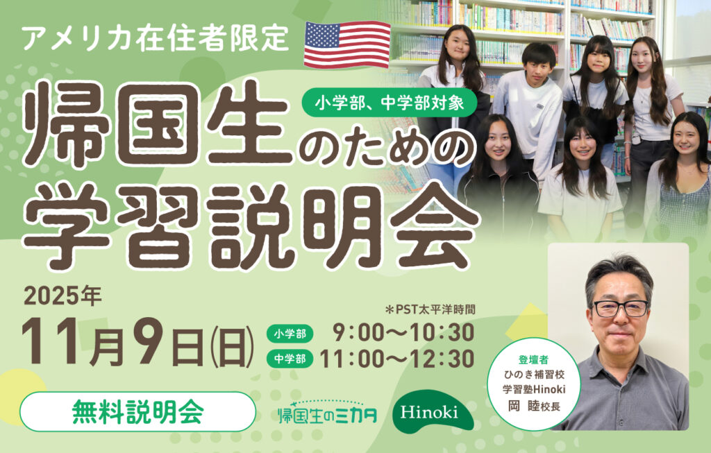 開催日時:2025年11月9日(日)9:00~10:30(小学部)、11:00~12:30(中学部) *PST太平洋時間 参加費:無料 |