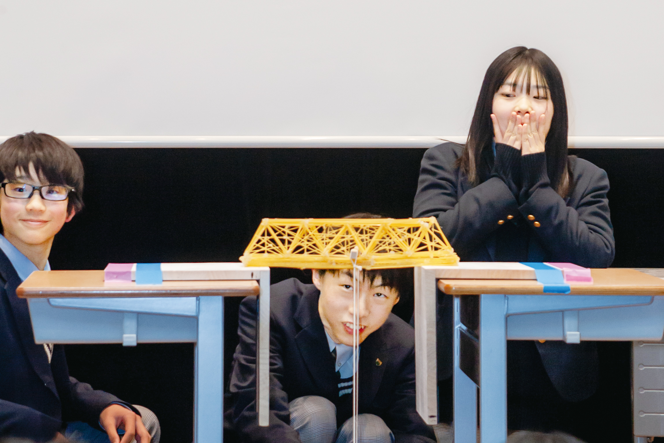 - 系列大学の見学や、教授や学生の講話を聴いたりする機会があるのはもちろんですが、特に人気が高いのはパスタブリッジ競技会。パスタを材料にして丈夫さと美しさを兼ね備えた橋を組み立ててグループごとに競います。